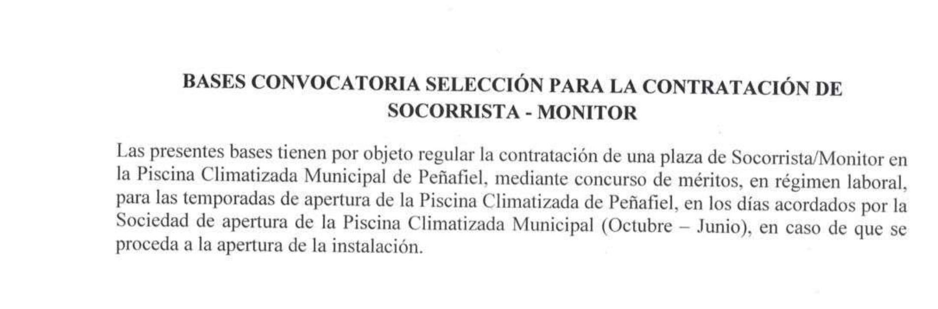 Adjuntas las bases de contratación de una plaza de socorrista/monitor en la piscina climatizada de Peñafiel, mediante concurso de méritos,...